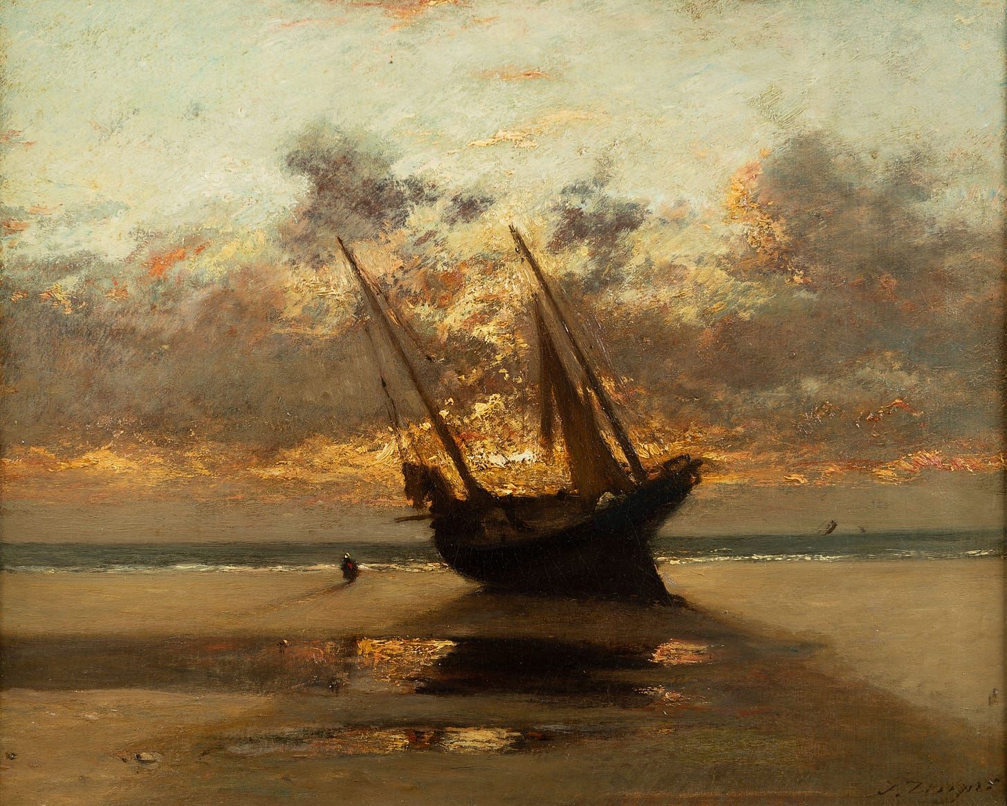 The Romantic era’s frequent musings on death play out in different ways. Jules Dupré’s lovely, twilit “Last Mooring” gives us a stranded ship, exhausted and seemingly as mortal as a beached whale. Constantin Meunier’s “The Suicide” takes away the poetic element of drowning, a trope since Ophelia’s death in “Hamlet,” by depicting a woman with gray lips, twisted limbs and clenched fingers. Looking at either work, we inevitably contemplate our own ends.