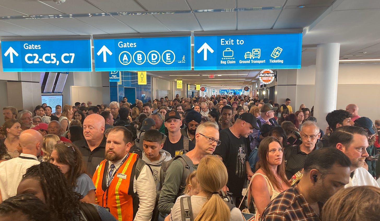 As Charlotte’s airport has grown, Concourses B and C can become crowded during peak times, as shown here last summer. The airport envisions extending and possibly widening those concourses. (Charlotte Ledger file photo)