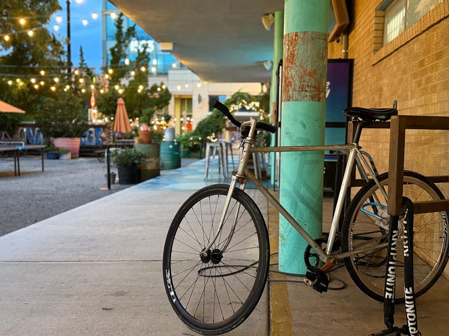 A bicycle sits in a rack outside a bike shop. (Photo by Rachel Black/The Charlotte Ledger)