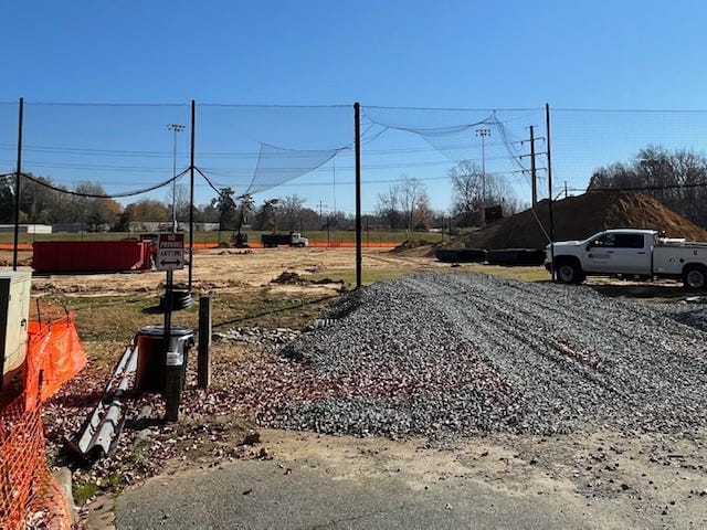 Pictured is the entrance to Charlotte FC’s first team practice field at Atrium Health Performance Park under construction. (Photo by Carroll Walton)