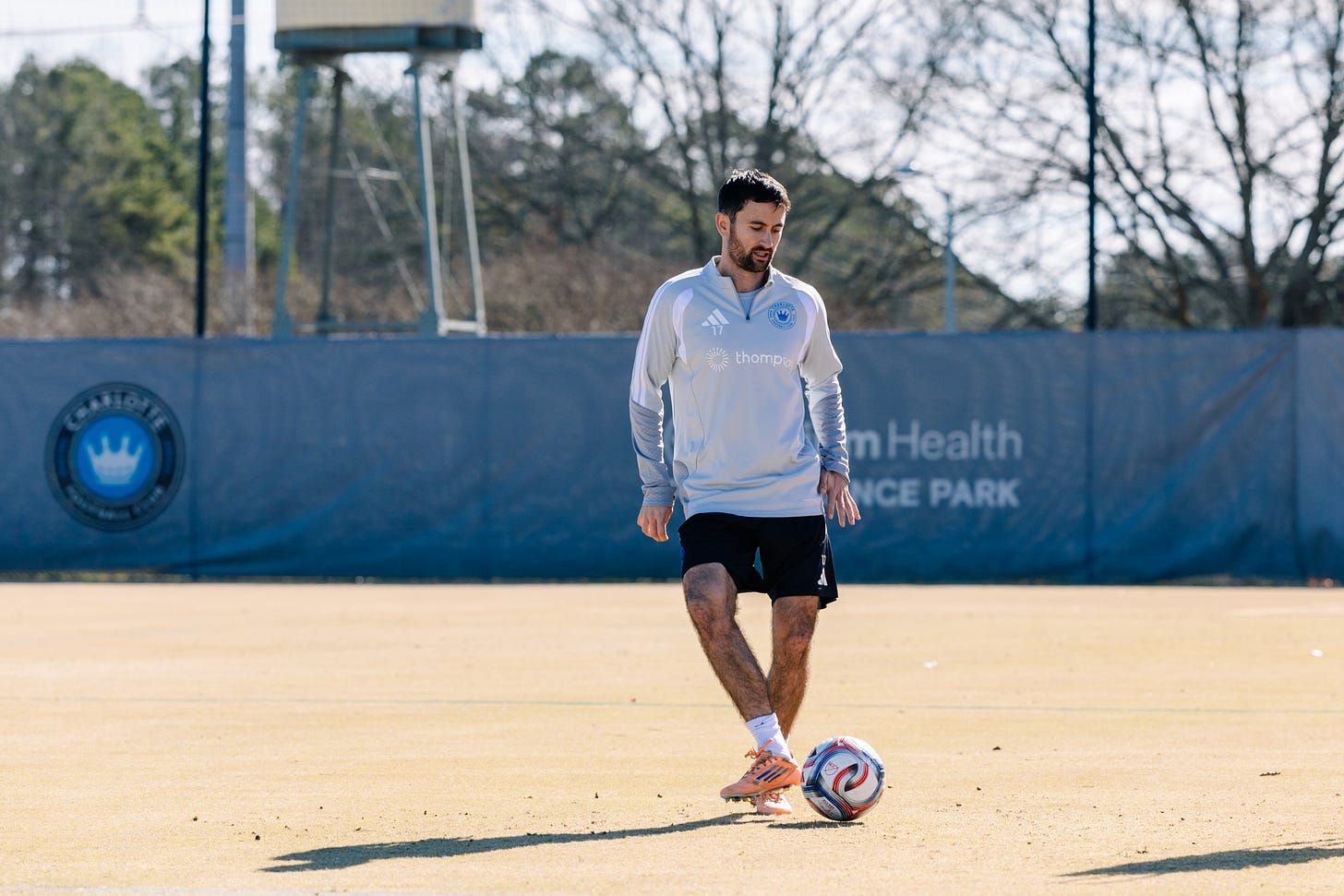 Luca de la Torre works the ball during preseason practice this week with Charlotte FC. (Photo courtesy of Charlotte FC.)