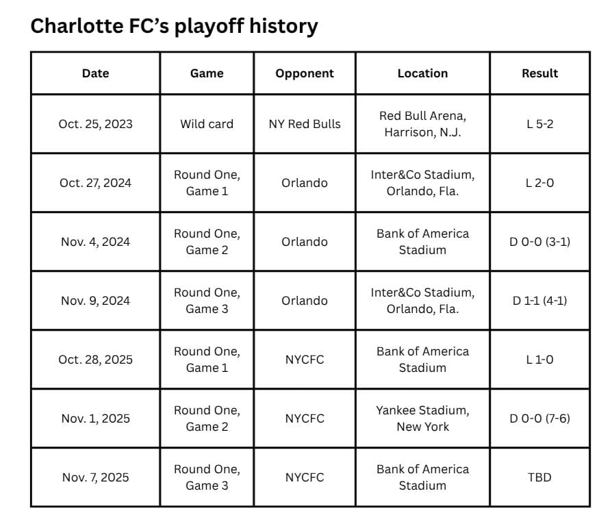 Charlotte hosts New York City FC in the win-or-go-home Game 3 in the best-of-three Round One of the MLS playoffs. The winner advances to play the Philadelphia Union in the Eastern Conference semifinals.