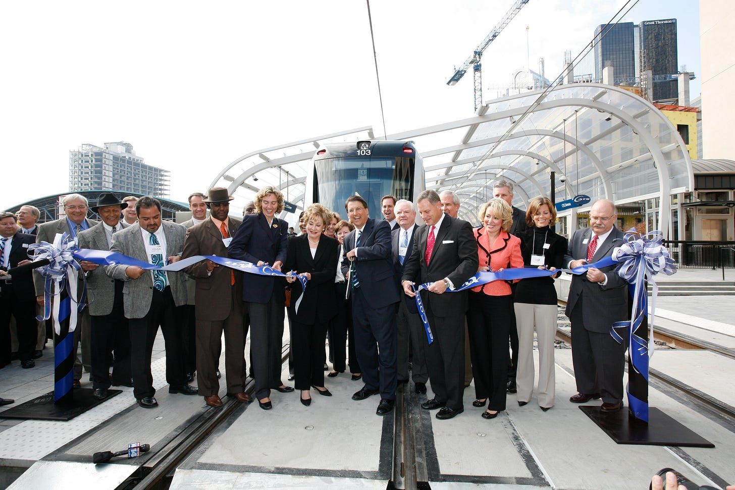 Former Charlotte Mayor Pat McCrory (center), flanked by former U.S. Senators Elizabeth Dole and Richard Burr, cuts the ribbon on the opening of the Blue Line uptown in 2007. (Photo courtesy of Charlotte Area Transit System)