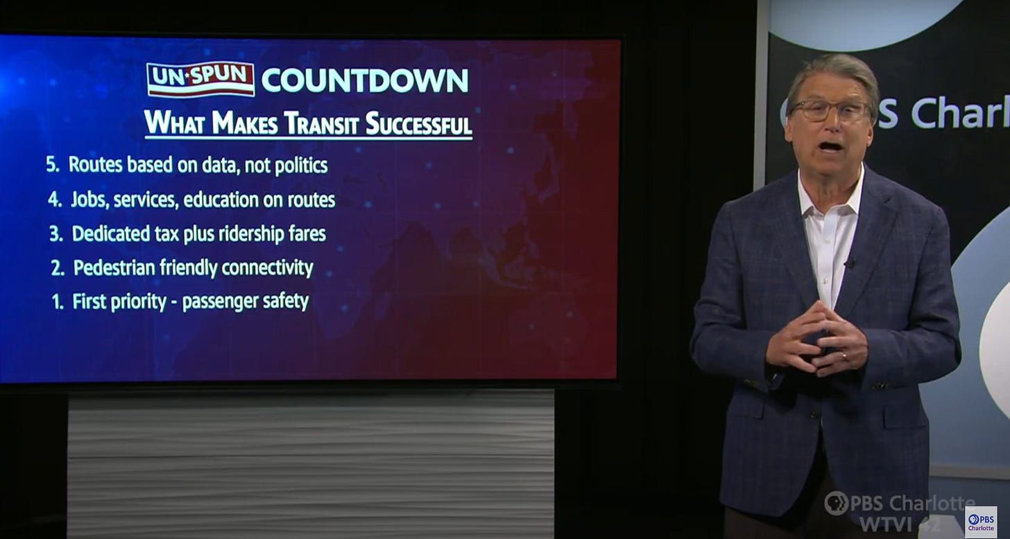 Former Charlotte Mayor Pat McCrory, who led Charlotte as it built its first light rail line, outlines his top five factors in making transit successful, on an episode last month of his talk show “Unspun” on PBS Charlotte.