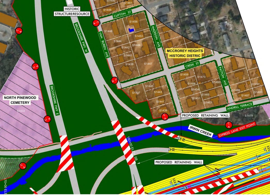 Building the express lanes at-grade would also impact Pinewood Cemetery and part of McCrorey Heights.