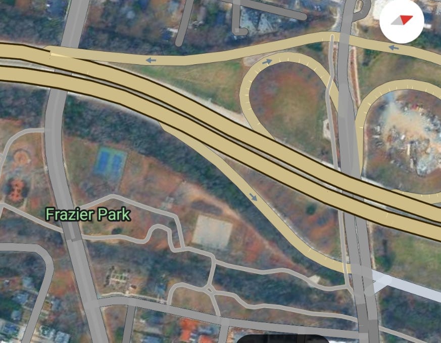 If the toll lanes were built at-grade, some homes in historic McCrorey Heights would be demolished for the new ramp, which is in red: