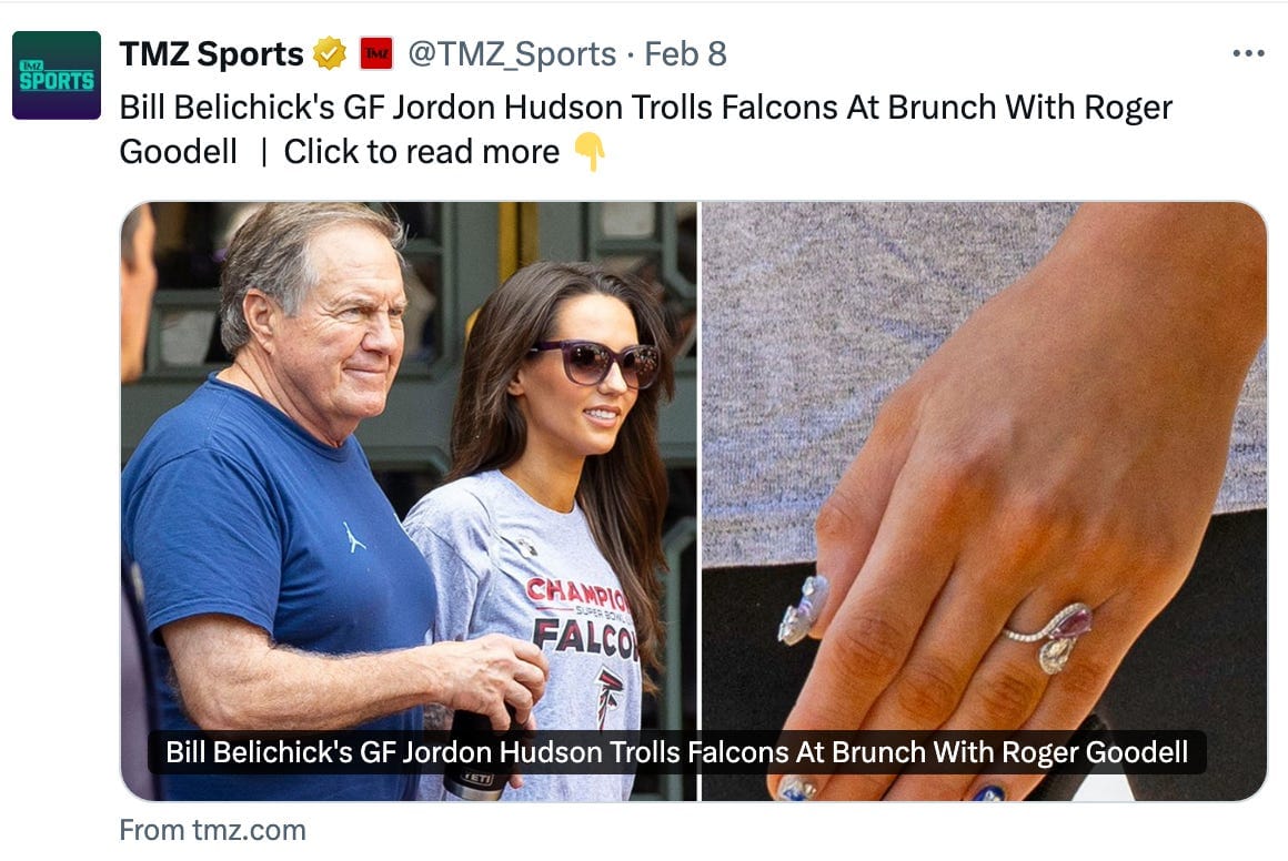 Loves me some internet, Super Bowl edition: Belichick and girlfriend troll Atlanta Falcons for infamous Super Bowl choke job