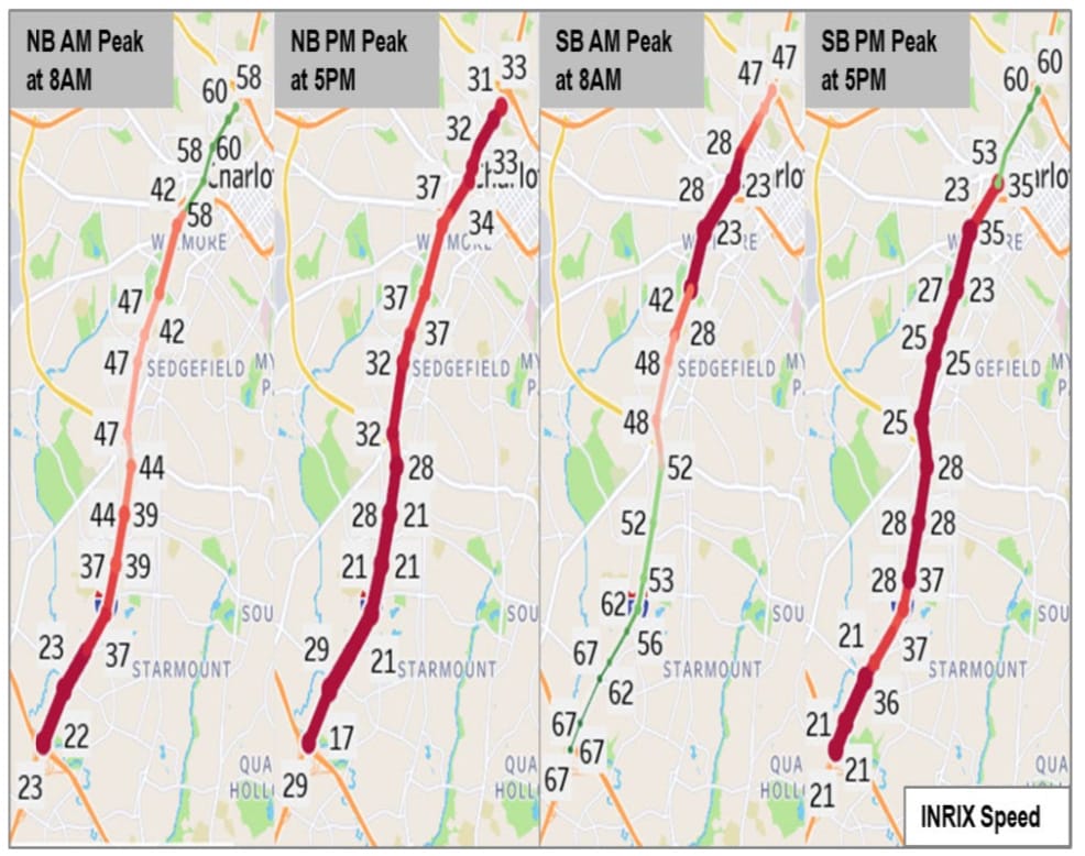According to a Cintra study in 2022, average traffic speeds on I-77 between uptown and the S.C. line dropped into the 20-30 mph range at some spots during rush hour. Left to right: northbound at 8 a.m., northbound at 5 p.m., southbound at 8 a.m., southbound at 5 p.m.