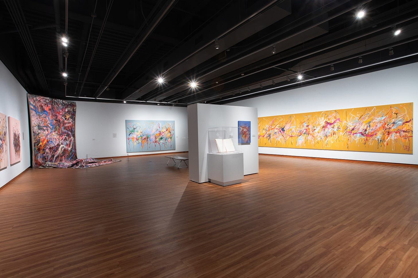 They began in 2011 as art therapy and probably still serve that purpose. The titles, so long that one would take up an entire paragraph, end like this: “Survival has become a prison and a gravity well swallowing me and all of our dreams whole.” A piece she calls “Red Sketchbook” contains only the sentence “I am dancing this grief and fury around and around,” repeated over two pages. One immense canvas starts at the ceiling, goes to the floor and protrudes into the room, like a tongue spilling out of an anguished mouth.