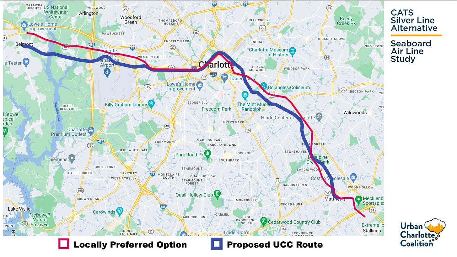 A group of transit backers is championing a route for the Silver Line that follows existing freight tracks (in blue), compared with the longtime favored route (in red). (Image courtesy of Urban Charlotte Coalition)