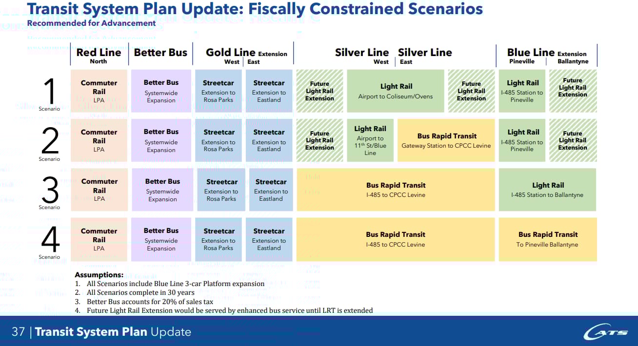 βReally difficult to pick a plan when there is little information regarding levels of service for rail or potential bus network overhauls. Running more buses on our current network, which is convoluted in design at best, will do nothing to support this growing city. Once again, I feel that CATS is bringing us a half-baked idea that does not provide enough commitment for real improvements. Thanks for the great coverage.β βWilliam Michael Agee